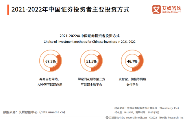 与此同时,近年来受用户习惯及疫情影响,线上交易服务需求快速增长。艾媒咨询数据显示,通过券商自有网站、APP等互联网应用进行交易的证券投资者数量占比达到67.2%。