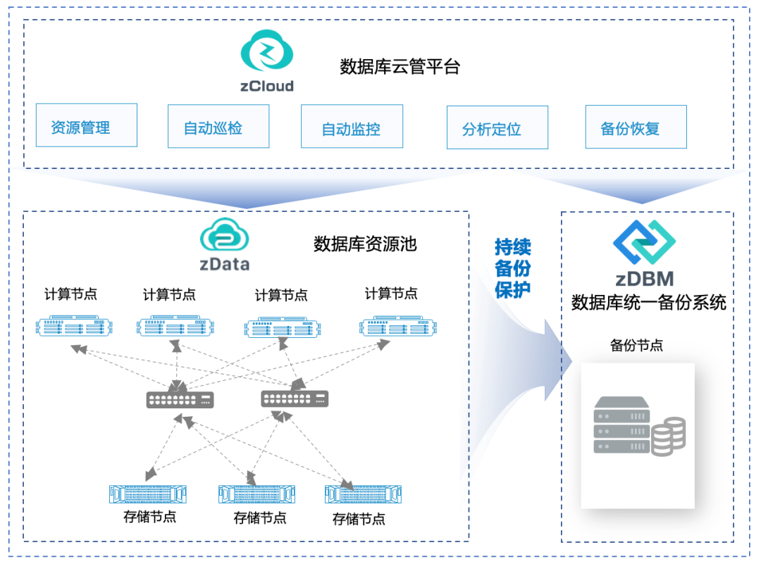 zDBM 数据库备份系统则是通过备份网络对数据库资源池进行持续实时备份保护,可用备份空间超30T。当数据库出现软硬件损坏、数据丢失、误删除操作时,zDBM 提供内置的数据库环境,通过备份数据的快照副本,可在几分钟内拉起数据库进行业务的快速接管,保障数据零丢失。