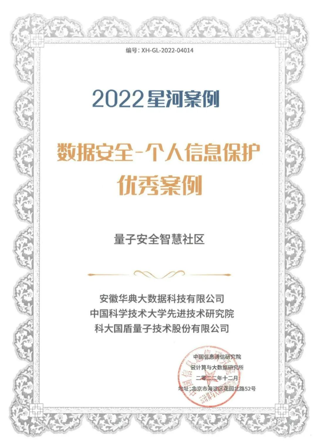 安徽华典大数据科技有限公司和中国科学技术大学先进技术研究院、科大国盾量子技术股份有限公司联合申报的“量子安全智慧社区”入选2022星河案例——数据安全个人信息保护优秀案例,是六届以来第一个通过量子技术实现树立行业标杆的星河案例。