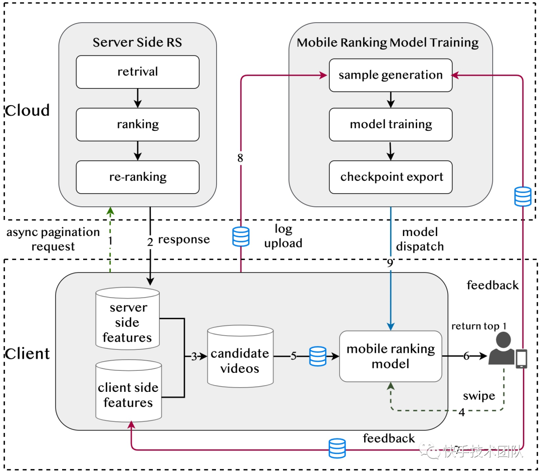 获奖论文《Real-time Short Video Recommendation on Mobile Devices》针对短视频推荐场景,传统服务端部署的推荐系统在决策时机和实时特征利用方面的不足问题,通过在移动客户端部署推荐系统来实时响应用户反馈,提高推荐结果的精准度,从而提升用户体验。论文提出的方案 100% 流量部署到了快手短视频推荐生产环境,影响了日均超过 3.4 亿用户的体验,是端上智能在大规模推荐场景落地的创新实践。