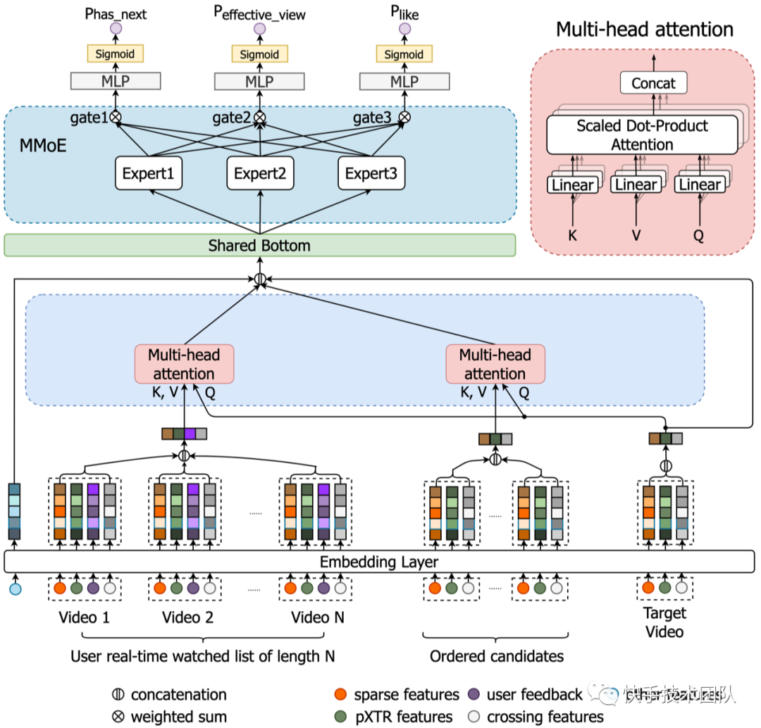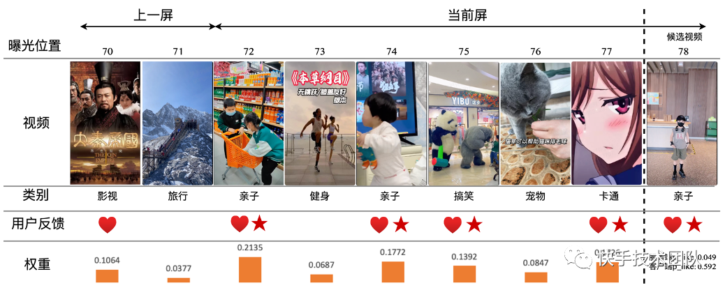 候选视频精排pXTR和观看历史视频pXTR的差。不同用户天然存在的 bias 会导致用户间的 pXTR 并不直接可比,比如有些用户 pXTR 会整体偏高或偏低,由于端上重排模型中没有用到 uid 等特征,直接用pXTR作为特征会干扰模型学习。通过 pXTR 之差可以消除这种 bias,并且以最近看过的视频 pXTR 为锚点,可以感知用户的实时兴趣偏好。 上次视频曝光时间之差。通常来说离当前时间越近的视频影响越大。 视频曝光位置之差。用户观看视频的速度通常变化较大,此时曝光位置之差比曝光时间之差会更稳定。两者结合起来可以建模视频在时间和空间上的互相影响。