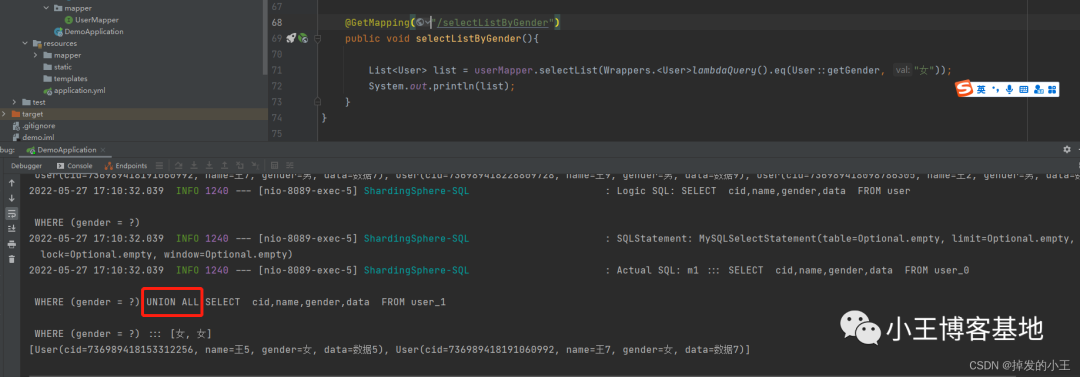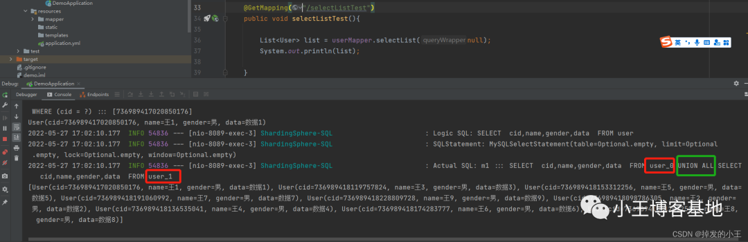 我们可以发现,我们根据分片字段进行in查询,sharding-jdbc会识别出来来自于那个表进而提高效率,不会所有的表进行全连接。