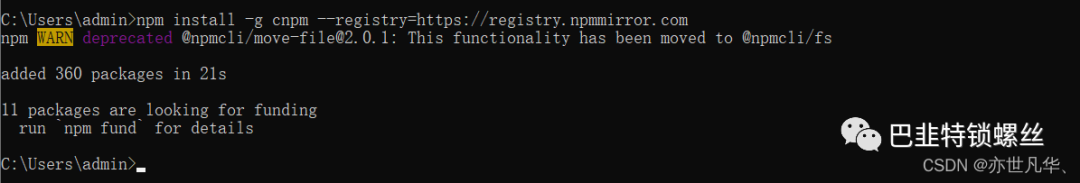 安装 cnpm:推荐这种方式是因为既不会影响npm命令,又不用每次都写淘宝地址进行依赖包的安装,向全局安装了cnpm这个工具。