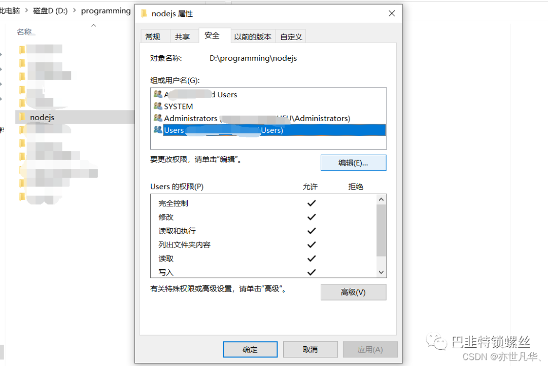 右键你的安装的node文件点击属性,再次点击安全,选择用户,点击下面的权限,点击应用,设置完后自定义的缓存文件就有权限了,在执行设置缓存路径即可。