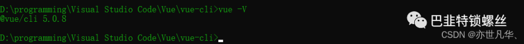 当安装完成之后,我们执行这个命令 vue -V 如果出现如下vue/cli版本号,则提醒我们安装成功。
