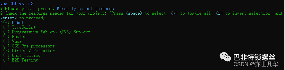 选择第三个选项敲回车会自动出现如下面板选项,继续让程序员进行选择:(空格来进行选择) 根据需求选择下面的内容,新手不推荐 Linter/Formatter 这种严格的规范化标准会整的你怀疑人生。