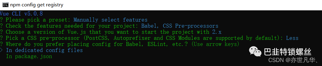 回车之后出现以下界面,询问你Babel、ESLint等第三方插件的配置文件是否需要放在独立的配置文件中?这里默认选择第一个,放在独立的配置文件里,便于后期的管理。