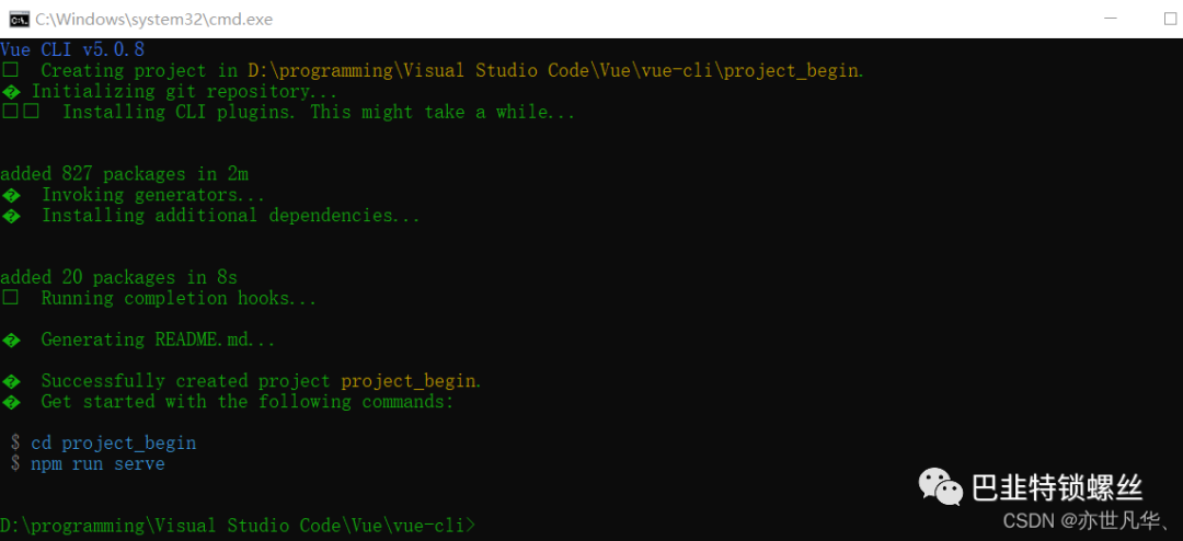 回车之后出现以下界面,提示你项目已经创建完成,运行项目的命令给出 npm run serve :