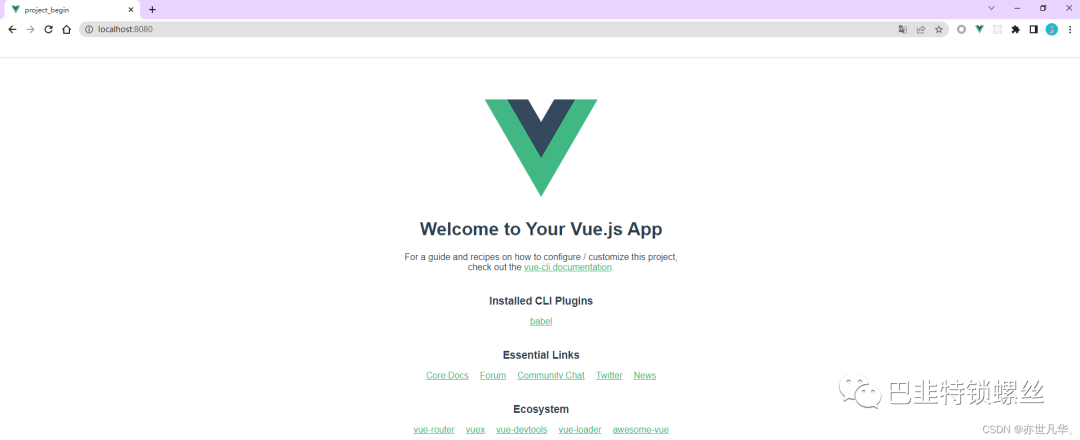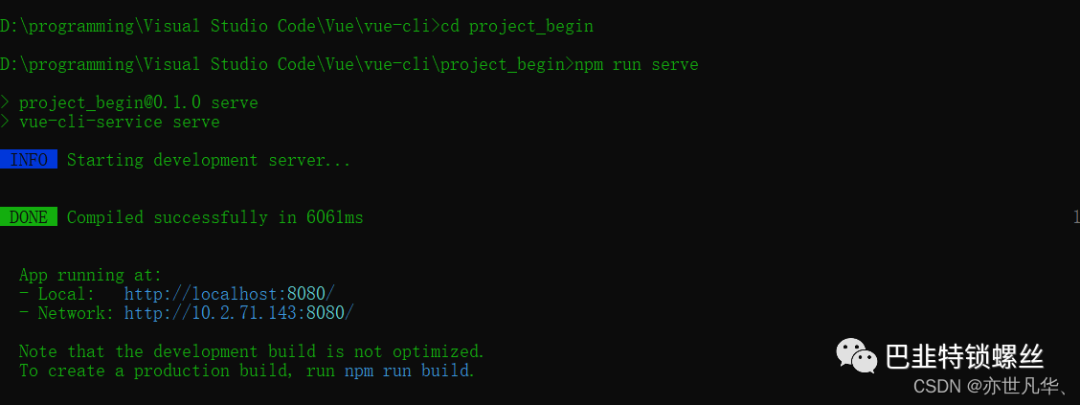 我们 cd project_begin 到项目根目录,然后执行 npm run serve 运行项目:复制 Local 地址到浏览器当中 (注意,当前这个终端窗口是不能关闭的其帮我们监听代码的变化,关闭,项目也就关闭了)