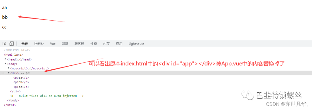 在工程化的项目中,vue 要做的事情很单纯:通过 main.js 把 App.vue 渲染到 index.html 的指定区域中。