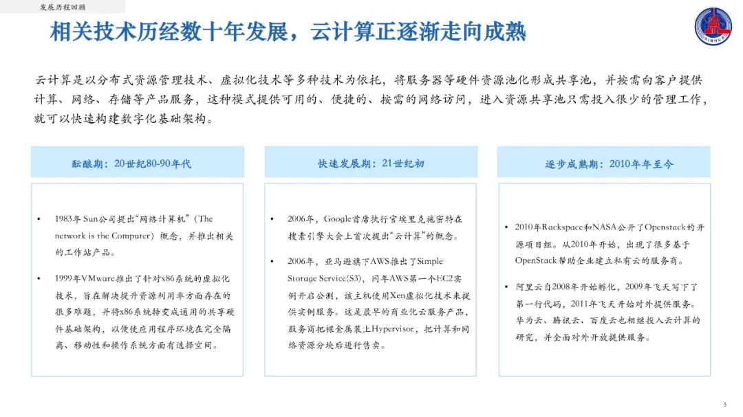 20世纪80-90年代,云计算行业整体处于酝酿期。这一阶段,有两个标志性事件。首先是1983年 Sun 公司提出“网络计算机”(The network is the Computer)概念,并推出相关的工作站产品。其次,1999年,VMware 推出了针对 x86 系统的虚拟化技术,旨在解决提升资源利用率方面存在的很多难题,并将 x86 系统转变成通用的共享硬件基础架构,以便使应用程序环境在完全隔离、移动性和操作系统方面有选择空间。