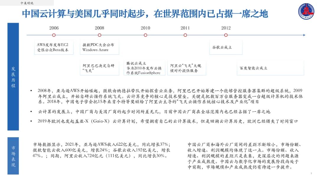 云计算竞争的核心是技术壁垒,关键是把数百万台服务器变成一台超级计算机的技术体系。在云计算的发展历史上,中国厂商与美国厂商的起步时间所差无几,目前中国云厂商在全球范围内也已经占据了一席之地。2008年,亚马逊AWS开始崛起,微软由纳德拉带队开始探索云业务。以阿里云和华为云为代表的中国云厂商则几乎在同时跟进。