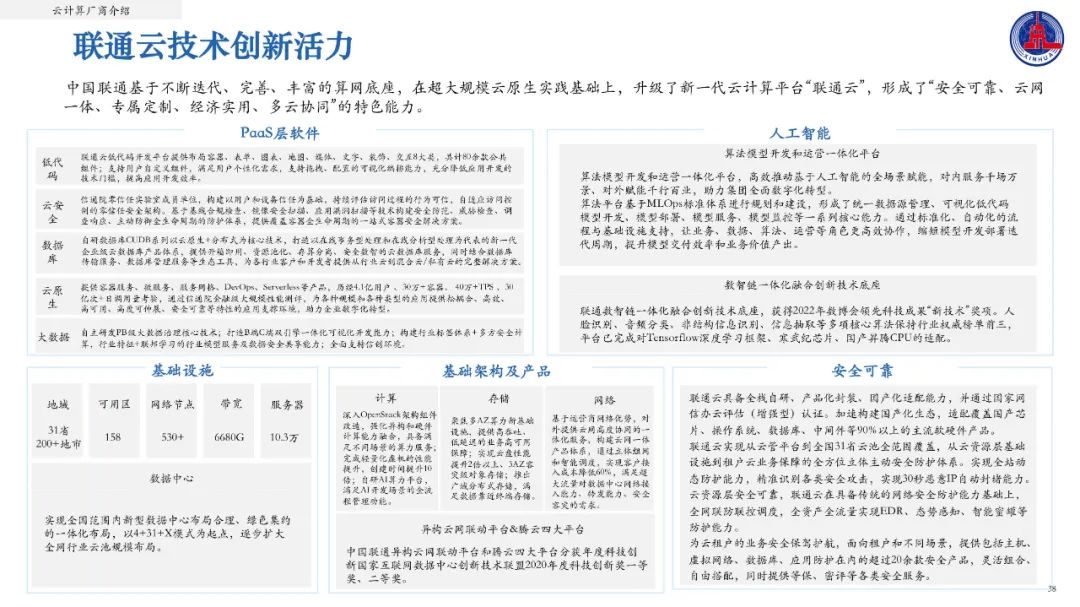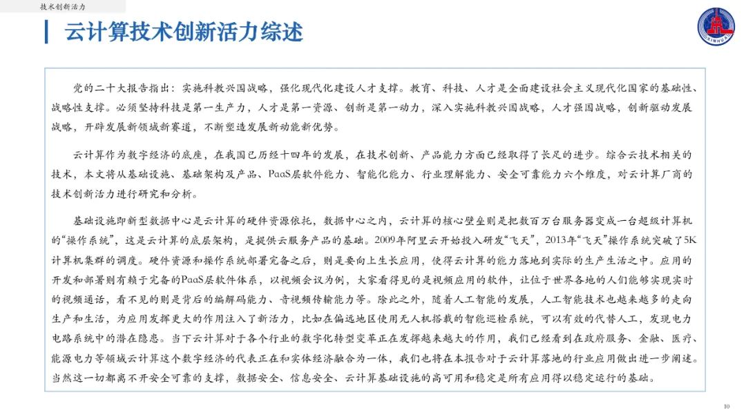 云计算作为数字经济的底座,在我国已历经14年的发展,在技术创新、产品能力方面已经取得了长足的进步。报告从基础设施、基础架构及产品、PaaS层软件能力、智能化能力、行业理解能力、安全可靠能力六个维度,对云计算厂商的技术创新活力进行了研究和分析。
