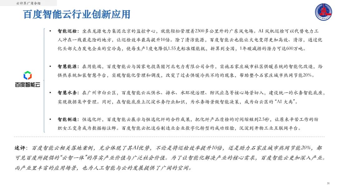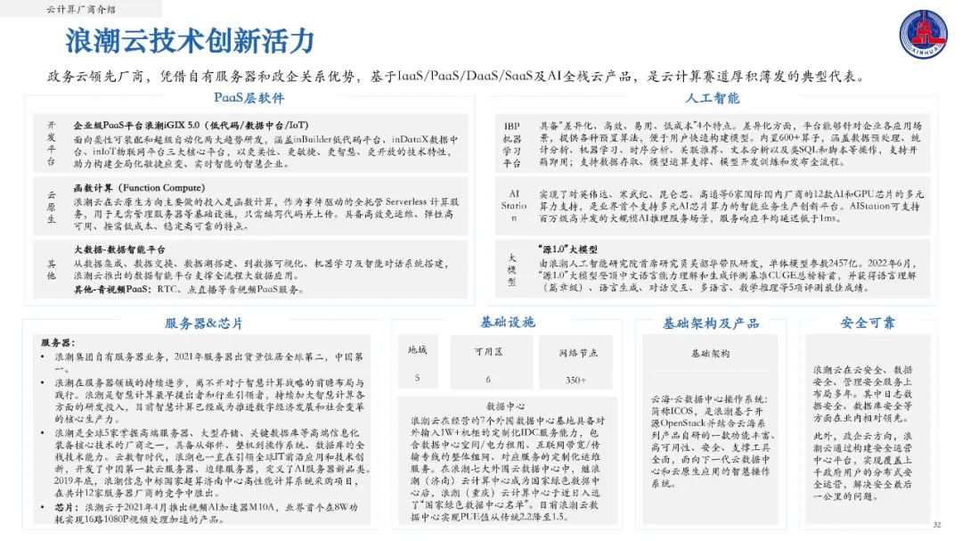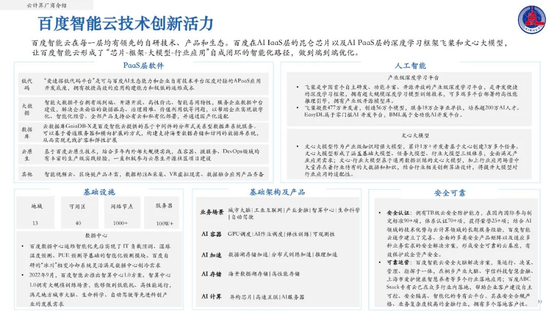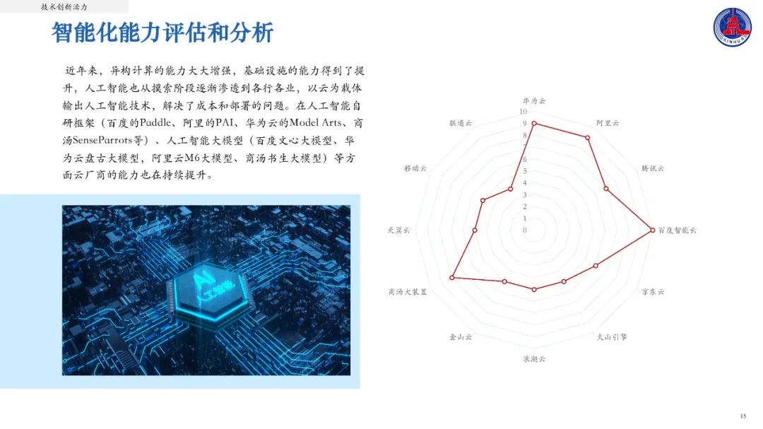 百度智能云、华为云、阿里云整体处于第一梯队。近年来,异构计算的能力大大增强,基础设施的能力得到了提升,人工智能也从摸索阶段逐渐渗透到各行各业,以云为载体输出人工智能技术,解决了成本和部署的问题。在人工智能自研框架和开发平台(百度的Paddle、阿里的PAI、华为云的ModelArts、商汤SenseParrots等)、人工智能大模型(百度文心大模型、华为云盘古大模型,阿里云M6大模型、商汤书生大模型)等方面云厂商的能力也在持续提升。