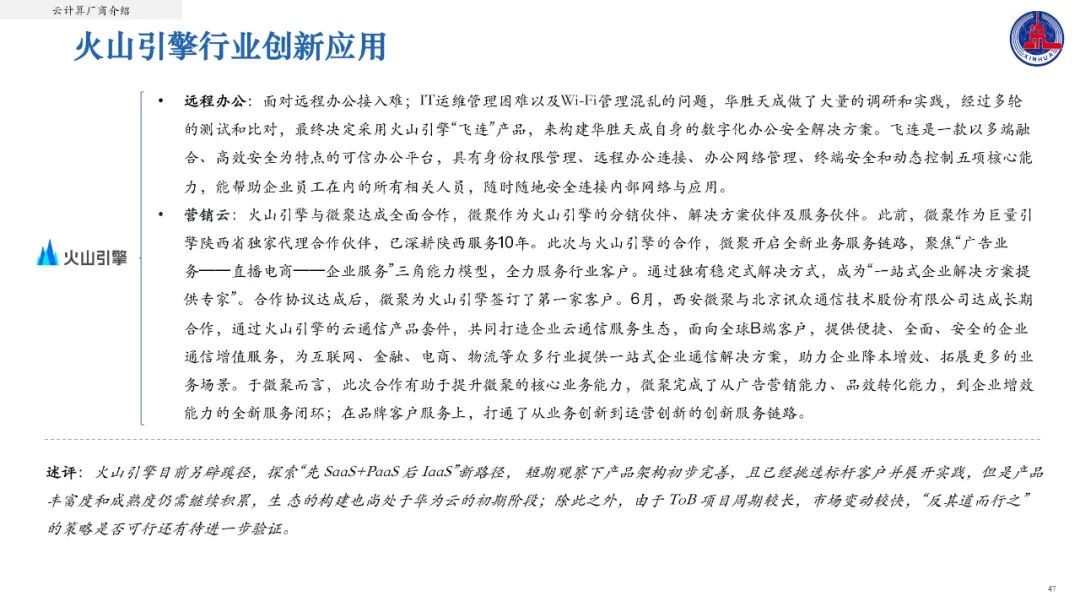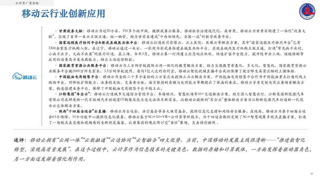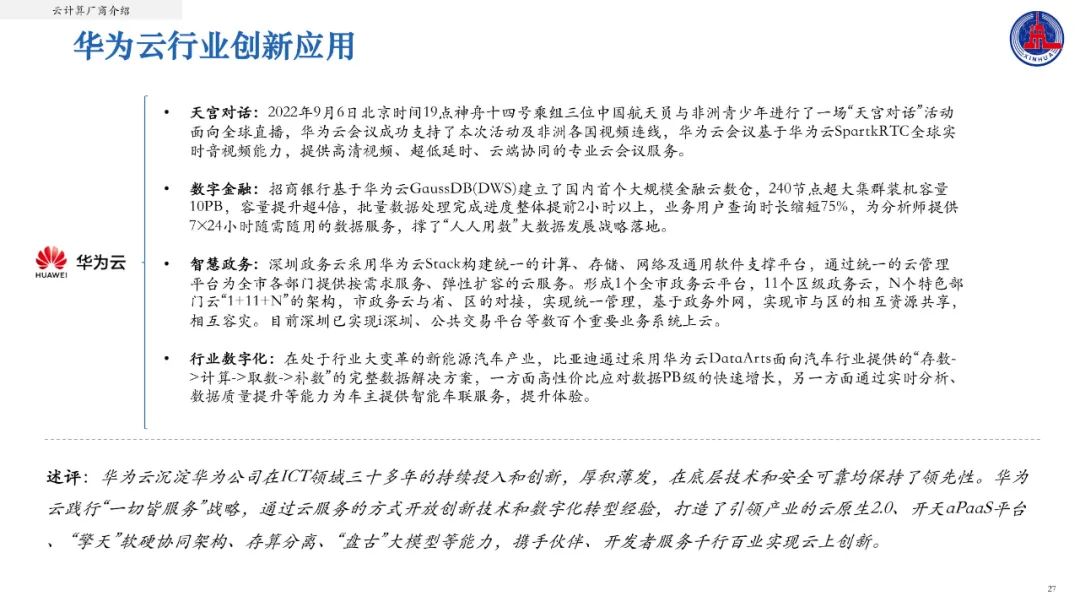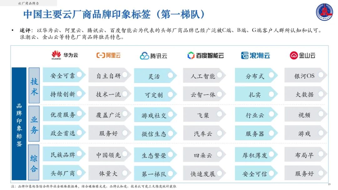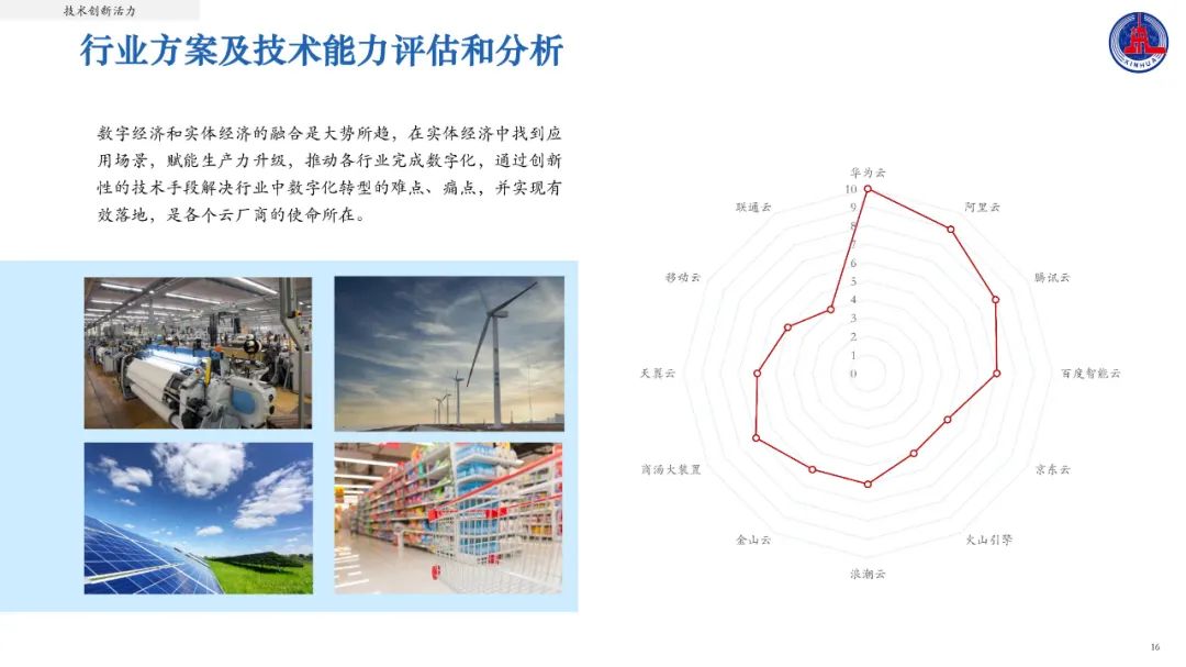 华为云、阿里云、腾讯云整体处于第一梯队。数字经济和实体经济的融合是大势所趋,在实体经济中找到应用场景,赋能生产力升级,推动各行业完成数字化,通过创新性的技术手段解决行业中数字化转型的难点、痛点,并实现有效落地,是各个云厂商的使命所在。