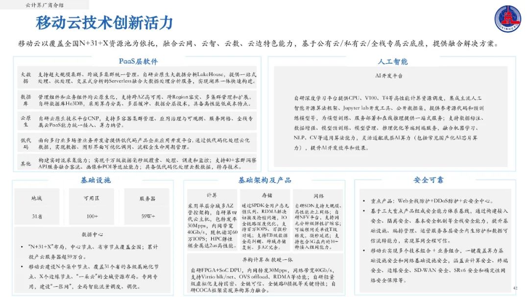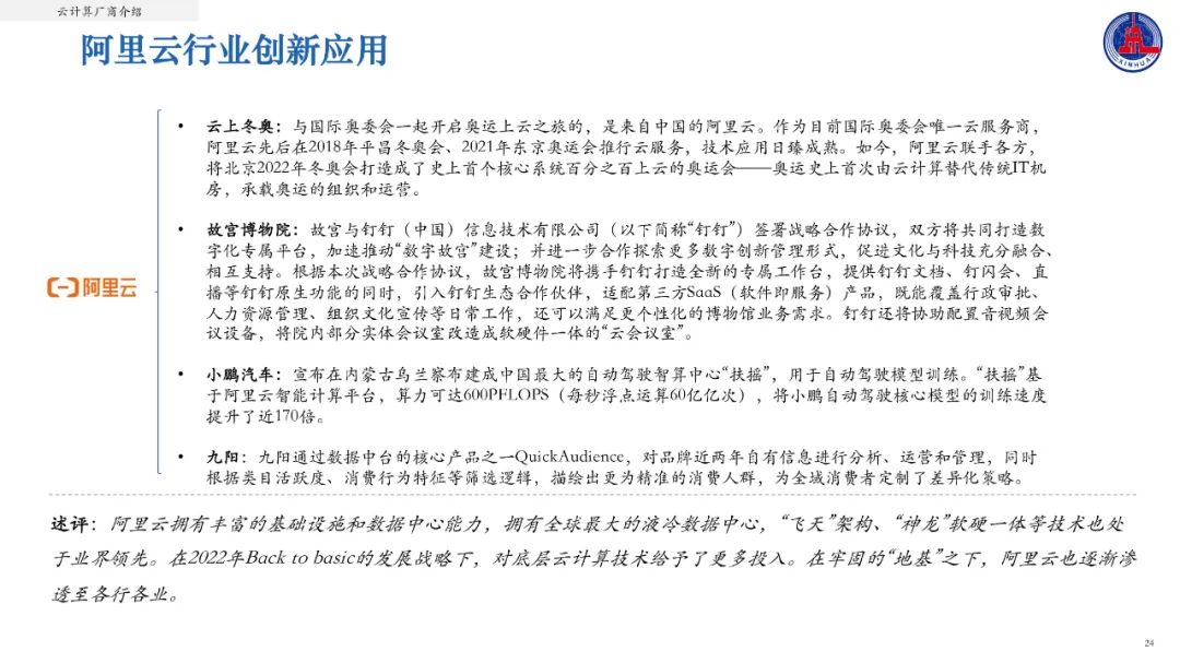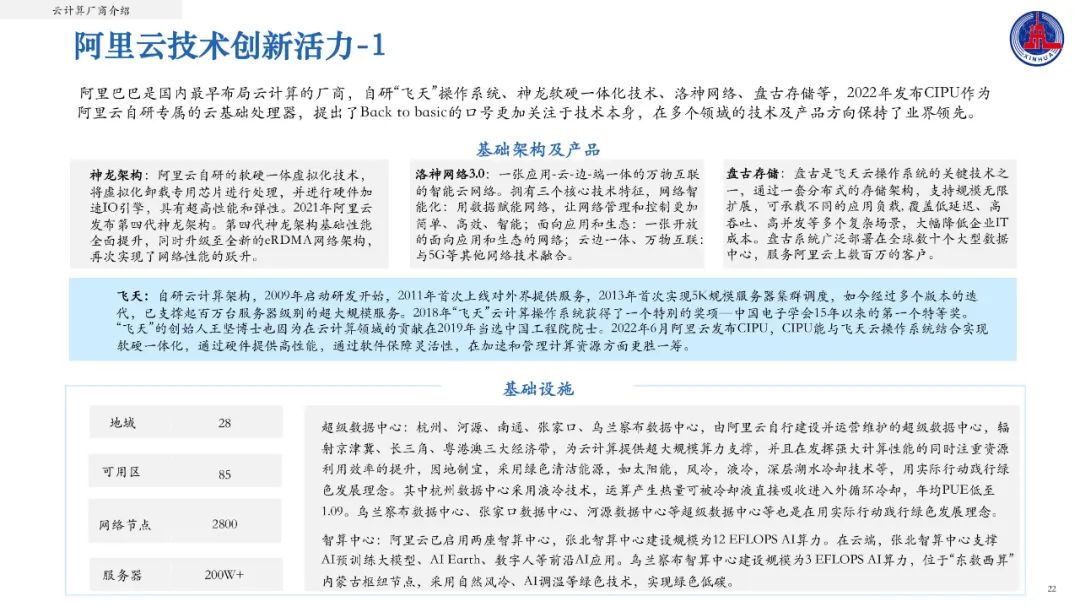 阿里云、华为云、腾讯云、百度智能云整体处于第一梯队。云计算基础架构是在计算环境中协同使用各个技术的基础,在虚拟化技术的加持下高达数十万台甚至上百万台服务器资源得以池化、统一调度并对外提供服务。计算、存储、网络等基础云计算产品的形态及功能也越来越丰富。