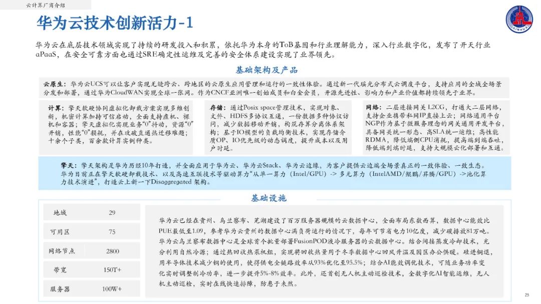 华为云、阿里云、腾讯云等中国云厂商整体处于第一梯队。目前,云厂商的大型数据中心正在向着新型数据中心演进,以支撑经济社会数字转型、智能升级、融合创新为导向,并实现了与网路和云计算的高度融合。另一方面,政务云、行业云等非公有云业务的数据中心也发展得越来越成熟。各个云厂商在数据中心的绿色低碳方面的投入也在逐渐增加。