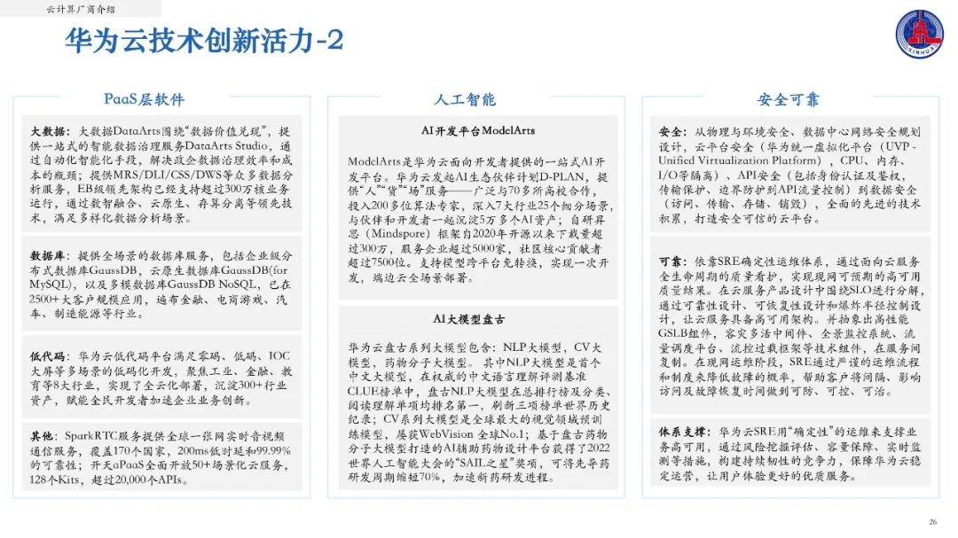 阿里云、华为云整体处于第一梯队。遍布全球的数据中心提供云计算的基础设施,是云服务厂商的底层能力,云原生、大数据、数据库、RTC等PaaS层能力,则起到了承上启下的作用,向下兼容了不同的基础设施,向上则支撑起了多种多样的应用。