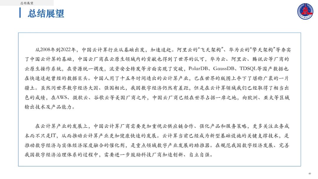 中国云计算与数字化市场的发展阶段尚处于中前期,市场规模和产业成熟度仍有待进一步提升,这将有赖于所有云厂商进一步深入技术、深入产业,强化产品和服务策略,从而推动云计算产业更加健康快速的发展。在规范我国数字经济发展、完善我国数字经济治理体系的过程中,需要进一步鼓励科技厂商加速创新、自立自强。