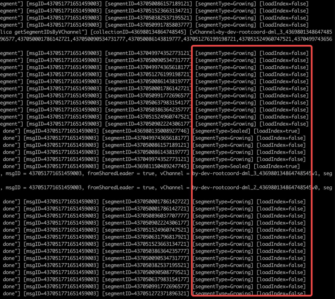 现象描述:多个线程,持续大规模插入向量数据后,通过日志排查,发现部分部分查询节点上的 segment 一直处于 growing 状态,虽然这些 segment 在写入节点已经 sealed 了,但是某个查询节点并不会自动重新加载这些 sealed segments,而是一直认为这些节点处于 growing 状态。由于 growing 状态的 segment 查询时不用索引,而是暴力搜索,这样会导致查询变得比较慢,需要手动操作 release。