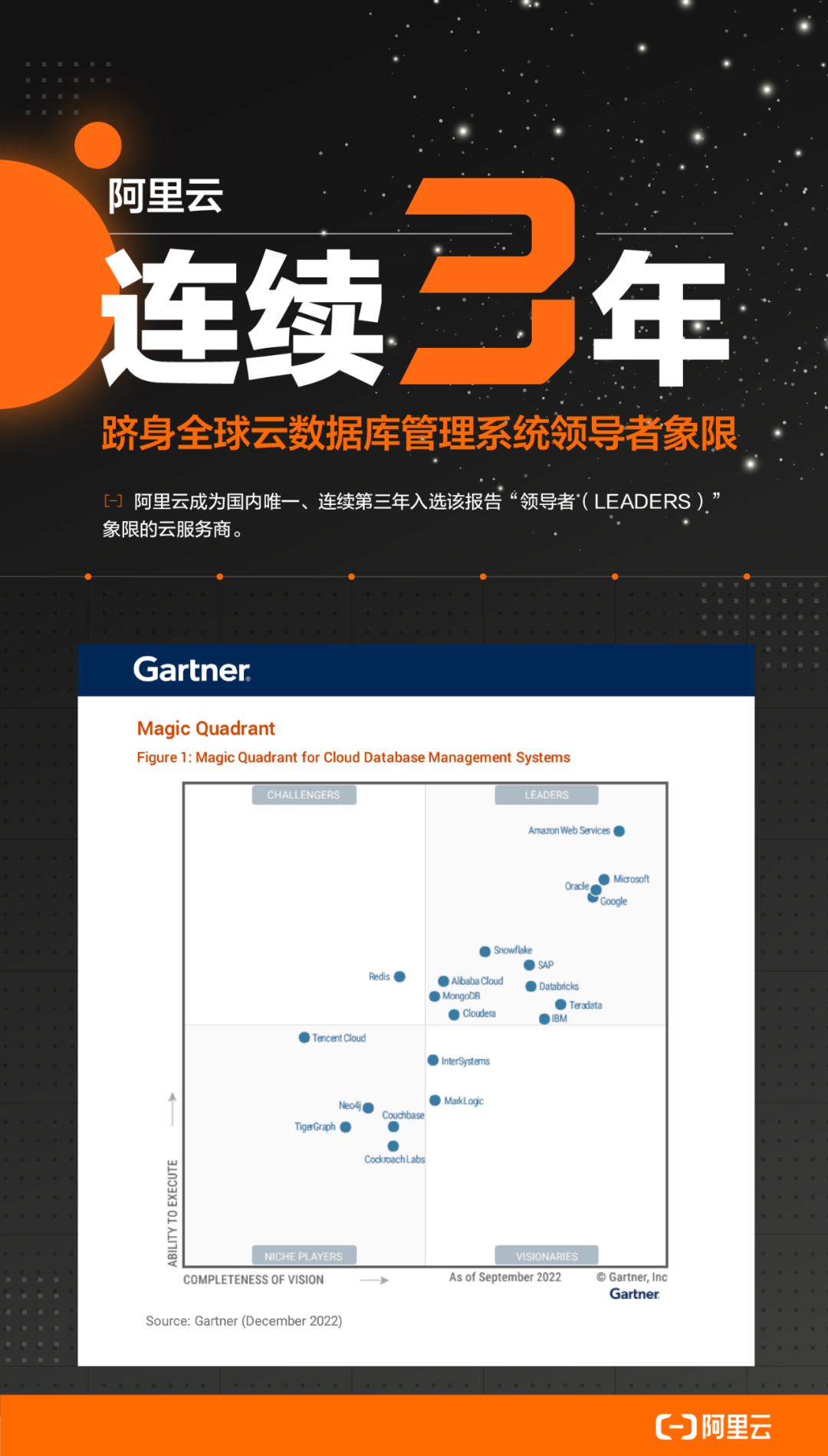 国际市场研究机构 Gartner® 日前公布《2022年度全球云数据库管理系统魔力象限报告》,阿里云成为国内唯一、连续第三年入选该报告“领导者(LEADERS)”象限的服务商。
