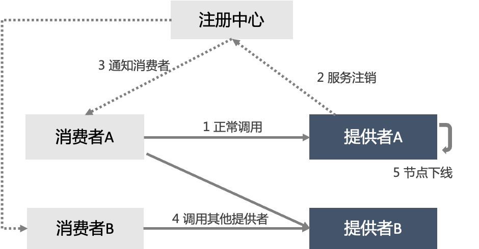 服务注册中心接收到服务提供者节点列表变更的信号后会,通知消费者服务提供者列表中的节点已下线。