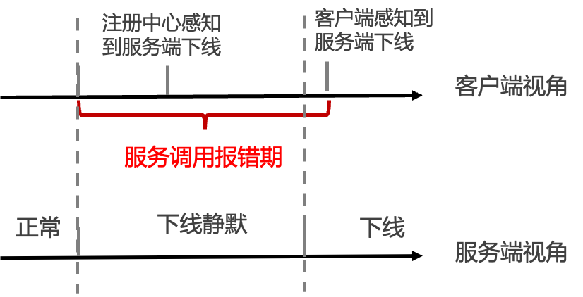 看似无懈可击的逻辑,但在微服务系统的实际运行过程中,会存在一些微妙的差别。其本质在于,从服务提供者确认下线,到服务消费者感知到服务提供者下线之间,存在时间差,这个时间差就是导致服务调用失败的窗口期。比如 Spring Cloud 使用的 Ribbon 负载均衡默认的地址缓存刷新时间是 30 秒一次,那么意味着即使服务消费者实时地从注册中心获取到下线节点的信号在负载均衡的地址缓存没有刷新前,依旧会有一段时间会将请求发送至老的服务提供者中。