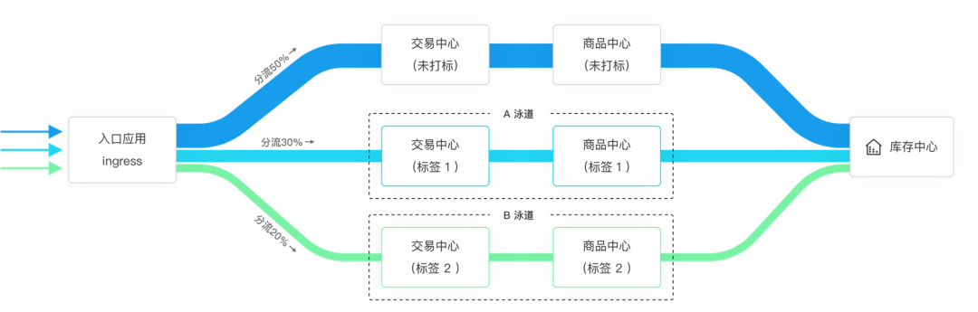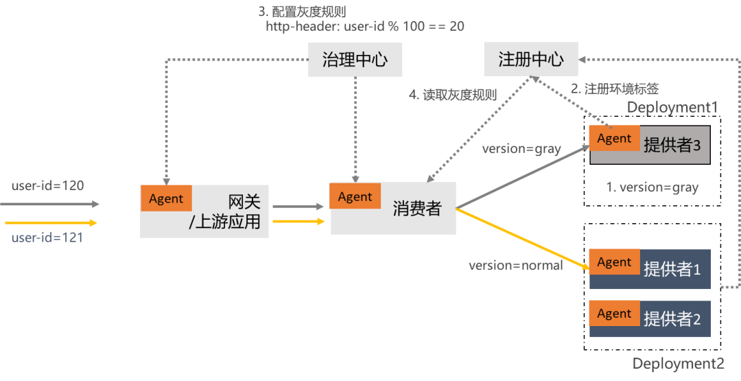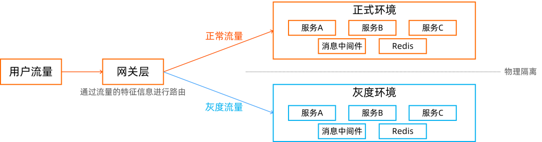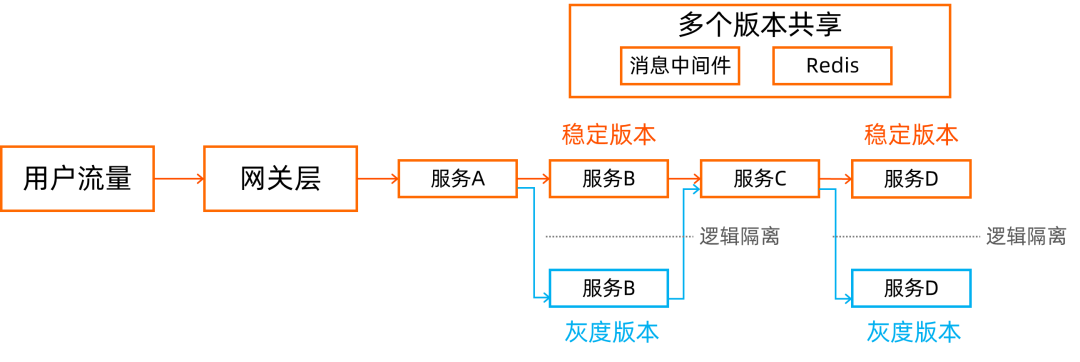 日志同步打印导致线程阻塞等其它问题。通过应用代码优化实现无损上线,并不是一件简单的事情,需要植入大量非功能性逻辑。特别在小流量预热这项技术上,需要让所有上游应用感知到应用上线的事件后,动态调整负载均衡规则,改造工作量极大。因此波司登的技术团队并没有自行从代码层实现无损上线,而是往无代码侵入的方向寻找无损上线的最优解。随着波司登微服务架构的不断演进,系统支持的业务也越来越复杂,与此同时,业务的迭代速度也发生了翻天覆地的变化。在进行微服务改造之前,新版本发布的频度是以月为单位,这跟现在每周有多个应用需要发布新版本的情况完全不在一个数量级。在经历了多次新版本发布导致的生产事故之后,波司登的技术团队吸取了之前的教训,参考阿里巴巴的安全变更经验,提出了安全变更”可灰度、可监控、可回滚“的原则,这就对波司登技术团队的变更管理提出了更高的要求。特别是在灰度策略上,简单的应用滚动更新不能控制业务流量通往新版本的比例,不能够满足安全变更的要求,需要有更高阶的灰度技术来支撑。为了实现灰度过程中的路由可控,波司登最初采取的方式是通过物理隔离的方式构建2套环境,每套环境都包含了全部的微服务应用,以及 Message Queue、Redis 等其他中间件。通过前置的网关层实现流量路由,决定用户的流量发送到正式环境还是灰度环境,路由的规则可以基于流量特征进行匹配,也可以设置为百分比。这套架构搭建完成之后,是能够非常好的胜任安全变更原则的,每次有新版本发布的时候,都可以基于可控的流量进行小规模验证。通过充分的验证之后再决定是否放大进入新版本的流量比例,或者及时回滚。但随着物理隔离方案的推广,其局限性也越来越明显的暴露出来。首先这样的架构存在严重的资源浪费问题,虽然可以尽可能利用云计算的弹性能力适配流量规模,但也只是降低了一部分资源,不能从根本上解决资源浪费的问题。而且需要用到的中间件产品往往不能像微服务应用一样灵活的弹性伸缩。此外,更重要的问题在于隔离方案需要整条业务线甚至全公司统一版本发布节奏,因为大家只有一套共享的灰度环境。微服务架构的规模越大,团队之间的分工会越明确,每个团队所负责的微服务应用在整个微服务架构中所占的比重也就越小。这样的方案在多团队协同作战的时候,极难协调多个团队的版本发布节奏,实际上严重拖慢了业务系统的创新迭代速度。因为物理隔离方案在实际生产中的局限性,业界更为推崇的是逻辑隔离方案。当需要对某一个微服务应用发布版本的时候,可以独立部署灰度版本,通过调用链路上的流量控制使得灰度流量能在灰度环境和正式环境间流转,实现灰度微服务应用的正常运行,帮助业务方进行新功能验证。逻辑隔离方案不需要做整套环境的冗余,大量节省了资源成本。更为关键的是,逻辑隔离方案可以让不同的团队各自决定自己的灰度节奏,并不需要所有团队都在同一个容器期进行灰度验证。这样不仅可以大幅度提升业务系统创新迭代速度,还能更进一步降低变更所带来的风险,因为职责分享以后,每个团队都可以拥有更长的灰度窗口期,灰度验证过程中遇到了问题也能更精确的定位到责任方。然而逻辑隔离的技术实现极为复杂,物理隔离方案仅需要在网关层控制路由策略,而逻辑隔离需要每一个微服务应用都必备识别灰度标识并动态控制路由策略的能力。在 Spring Cloud 框架下,微服务应用之间相互调用的负载均衡机制由 Ribbon 实现,实际上属于应用层 SDK 的能力范围。动态控制路由策略相当于动态控制 Ribbon 的负载均衡策略,改造起来会有比较大的工作量。逻辑隔离机制更为复杂的技术实现在于灰度标识的全链路透传,也就是针对每一个用户请求,如果在微服务应用间流转的过程中被打上了灰度标识,这个灰度标识就必须在接下来的链路中一直传递下去。比如上图 B 服务的灰度服务在调用 C 服务的时候,因为 C 服务并没有灰度版本,所以加到了 C 服务的稳定版本,但接下来的 D 服务是同时存在稳定版本和灰度版本的。这里就存在一个潜在的需求:凡是经过了服务 B 灰度服务的流量,都应该发往服务 D 的灰度版本。这个需求能够实现的必要条件,就是灰度标识的全链路透传。微服务应用之间的灰度标识全链路透传可以借助于 ARMS 等链路监控工具而实现,存在一定的代码改造工作量。但更为复杂的是,如果链路中存在基于消息中间件的异步调用,就不能仅仅通过调整应用层的负载均衡机制来控制路由策略了,需要对消息中间件的服务端和客户端都进行适配,存在大量改造工作量。跟无损上线一样,波司登的技术团队也没有急于求成对应用层代码进行大刀阔斧的改造,而是与阿里云团队共同探讨更优雅的解决方案。微服务引擎 MSE 是阿里云面向业界主流微服务生态提供的一站式微服务平台,包括注册配置中心、云原生网关和微服务治理3款可以独立输出的产品。对于注册配置中心和云原生网关,波司登已经比较熟悉了,分别为微服务架构提供了 Nacos 以及 Kubernetes Ingress 服务。关于第3款产品微服务治理,波司登的技术团队有过深入的研究,对于解决安全变更领域的多个难题都能带来帮助,但对于微服务应用全面接入 MSE 微服务治理,波司登还是存在一些顾虑。主要的顾