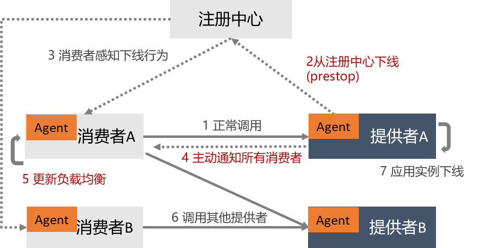 主动通知所有消费者。这是最为关键的一步,Agent 绕过注册中心,直接给所有消费者发送了实例下线的通知,这样消费方能够立即感知到下线行为。