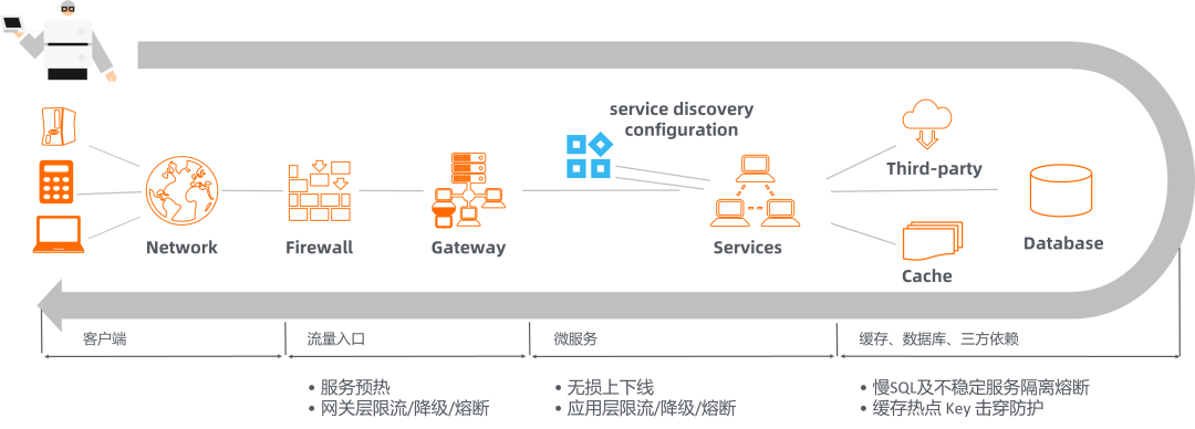 应用变更频繁造成事故。为了适应互联网业务需求的不断变化,应用变更在大型微服务架构中,是极为频繁的工作。新应用的上线、新版本的发布、新配置的推送、应用扩容、应用缩容,这些都属于应用变更的范畴。微服务架构的复杂性以及业务的快速迭代,让波司登的技术团队在每次应用变更中都疲惫不堪,因为绝大多数生产环境的事故都由应用变更导致。这个难题不能简单靠云产品来解决,需要技术团队深入剖析每一次事故的根因,针对性的进行优化,并建立一整套安全变更的行政机制,确保每一次变更都能让团队高枕无忧。第2个难题属于微服务治理的范畴,微服务治理是微服务化深入的必经之路,涵盖流量治理、服务容错、安全治理等多个领域,帮助更低成本、更稳定、更高效地开发,运维微服务应用。在波司登的实战经验中,上下线有损问题和安全变更问题造成的业务影响最大,波司登的技术团队围绕着这几个问题进行了深入探索。