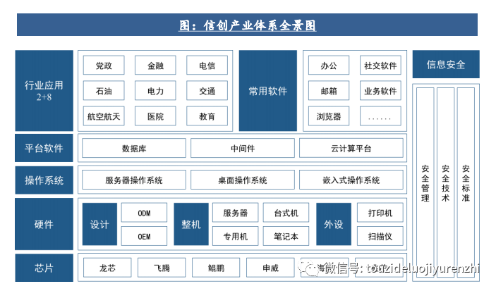 信创,即在中美对抗日趋明显的形势下,从国家安全自主可控角度出发,在党政军领域及关乎国计民生根本的基础性行业,像金融,电信,电力,石化,交通,航空航天,教育,医疗,实现 IT 系统软硬件全面国产化替代。这就是信创。