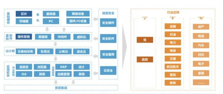 所涉及领域包括硬件方面(CPU芯片、服务器等);软件方面(操作系统、数据库、中间件等);上层应用方面(办公软件、ERP等;信息安全方面,如边界安全产品、终端安全产品等)。其中芯片、整机、操作系统、数据库、中间件是最重要的产业链环节。