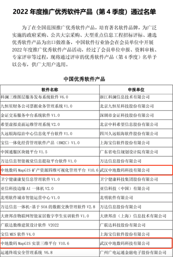 为了推广优秀软件产品,培育著名软件品牌,中国软件行业协会开展了2022年度推广优秀软件产品活动,经过严格的资料审核、专家评审等过程,中地数码MapGIS实景三维平台V10.6、MapGIS矿产资源四维可视化管理平台V10.6两项产品成功入选“2022年度优秀软件产品名单”!