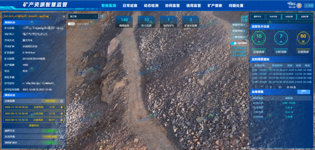 在业务开展中,中地数码依托MapGIS平台创新技术,聚焦矿产资源监管核心业务需求,构建以数字化、网络化和智慧化为支撑的矿产资源智慧监管体系,建立健全长效机制,探索形成矿产资源智慧监管新方法、新模式。同时,以“边坡监测监管”、“越界开采监管”、“生态环境监管”三大监管子场景为切口,围绕日常巡查、动态监测、问题处置、协同监管、信用监管、矿产督察和问题处置等场景,实现矿产资源监管全业务闭环管理。
