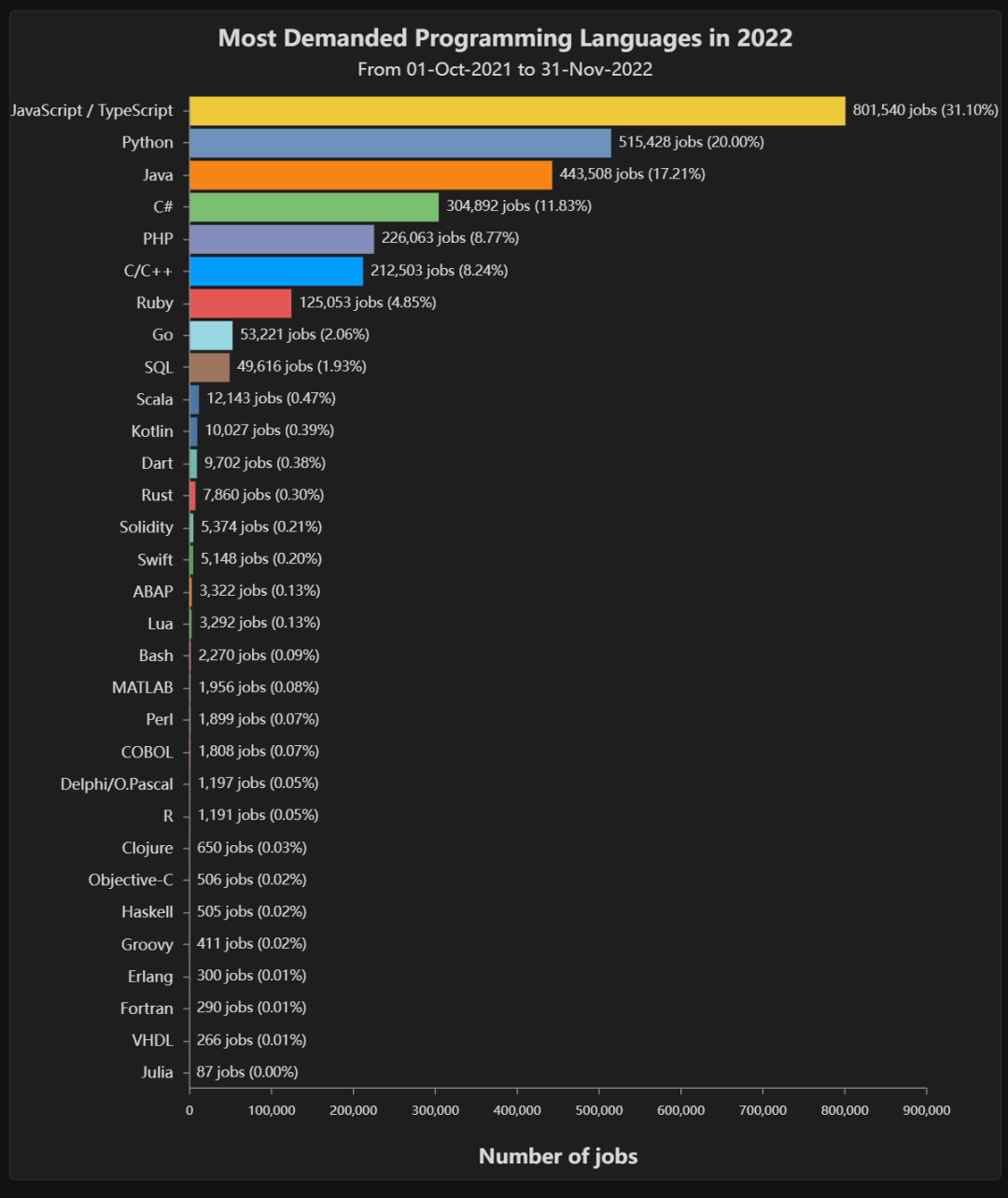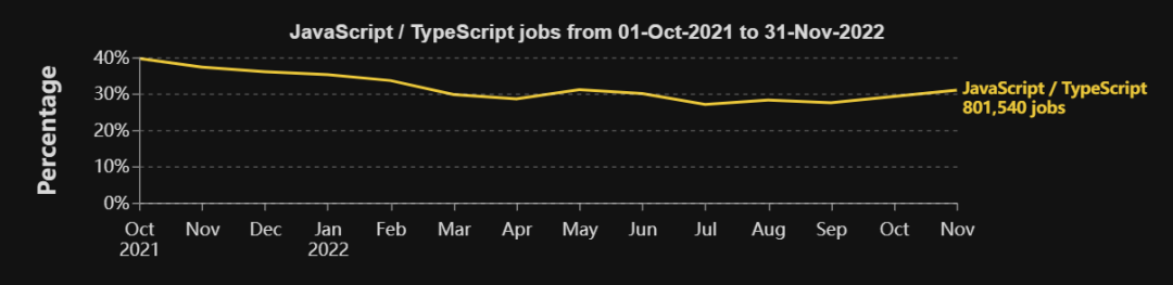 从 2021 年 10 月到 2022 年 11 月(十四个月),DevJobsScanner 共发现了 801K 个工作机会,占具有明确编程语言需求工作中的约 31%。
