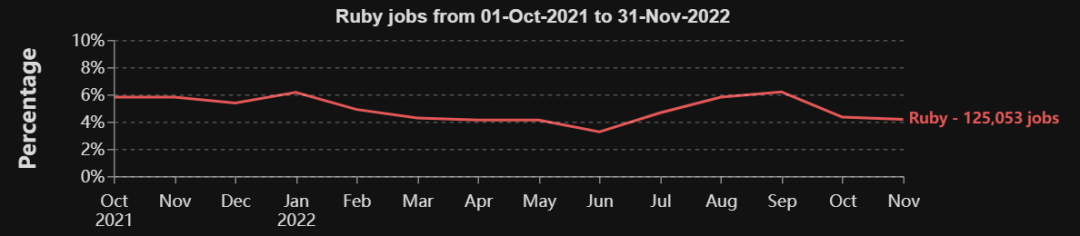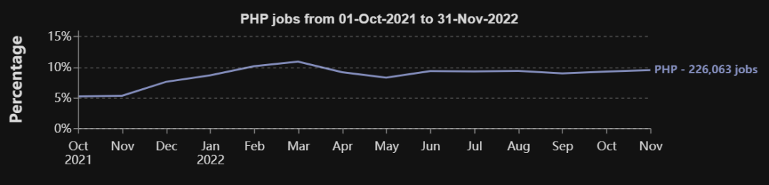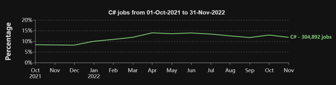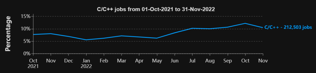 C#、C/C++ 和 PHP 也是值得关注的语言,因为它们有着一致的上升趋势。例如,在 2021 年 10 月 PHP 的需求还只占总需求的约 5%,但到 2022 年 11 月占比就已经接近 10%,几乎翻了一番。