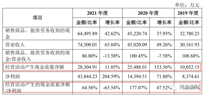 据了解,达梦数据软件产品使用授权业务终端用户主要集中于党政、能源和金融等领域。2019年至2021年,公司软件产品使用授权收入占主营业务收入比重分别为69.32%、82.42%、86.57%。与此同时,公司经营活动产生现金流量净额分别为10,052.15万元、25,488.01万元、28,304.91万元,占同期净利润的比例分别为120.03%、177.07%、64.56%。也就是说,在公司营收高速增长的背景下,其经营活动产生现金流量净额却仿佛踩下了“急刹车”。