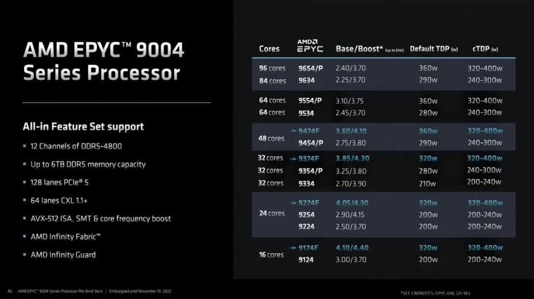 总的来看,EPYC 9004系列带来了更多的核心、更高的频率、更强的内存与扩展链接、更深入的安全。并且,全新工艺、全新架构还有着极高的能效。96核心控制在360W,84核心不过290W,平均每个核心只有3.5W左右。正是基于这样的高能效,EPYC 9004系列可以在同样的性能下,节省机柜空间,减轻散热压力,降低TCO总拥有成本,完美契合节能减排、绿色可持续发展的大趋势。