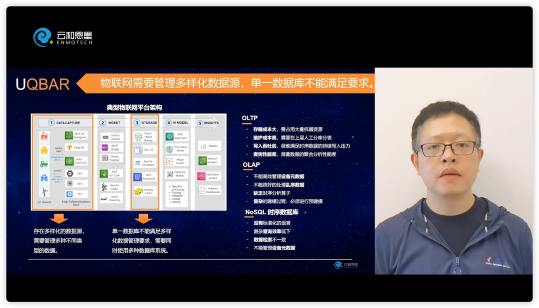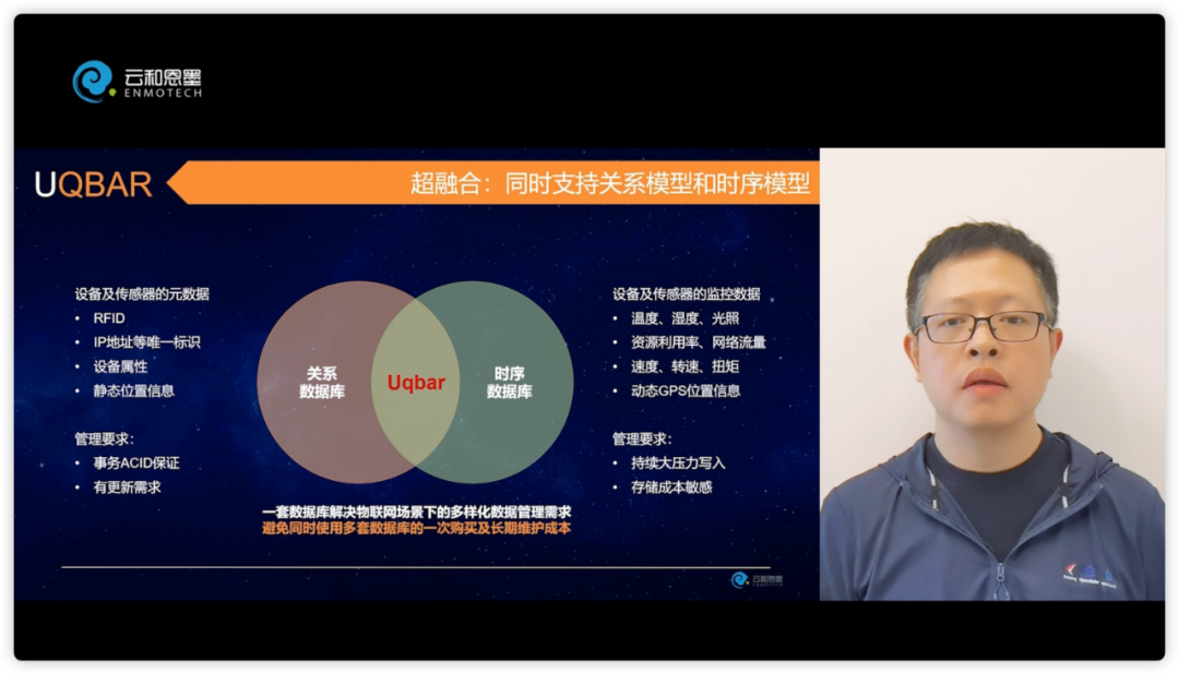 张程伟首先通过典型物联网平台架构为我们分析了当前物联网场景下数据管理所面临的挑战。每一种设备产生的数据源的格式、类型都可能不同,当前任何一个单一的数据库都不太能满足物联网场景产生的所有数据源的管理需求,那么就需要多种不同的数据库来处理不同的数据,这无疑会大幅增加使用成本和管理成本。因此,云和恩墨开发了一款能够同时支持关系模型和时序模型的超融合时序数据库产品—— Uqbar(音译:乌克巴尔),目标是能够提供物联网场景下的一站式数据处理能力。
