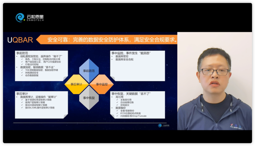 第三个价值点是“安全可靠”。Uqbar 采用主备高可用架构,支持两地三中心、多机房部署,通过内置集群管理及高可用组件Cluster Manager,能够监控并发现Uqbar Server主备集群的故障,第一时间实现自动倒换,从而满足业务对连续性的高要求;除此之外,张程伟还介绍了 Uqbar 中完善的数据安全防护体系,通过细粒度权限管理、通信加密、操作审计、备份恢复等,可以实现事前、事中、事后的全方位防护。