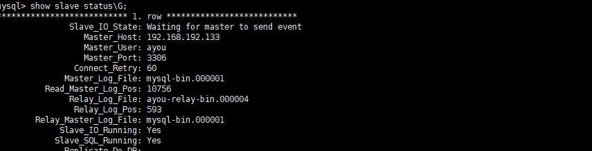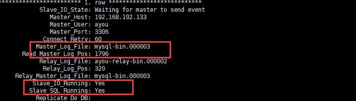 change master to master_host='192.168.192.133',master_user='ayou',master_password='123456',master_log_file='mysql-bin.000003',master_log_pos=1796;