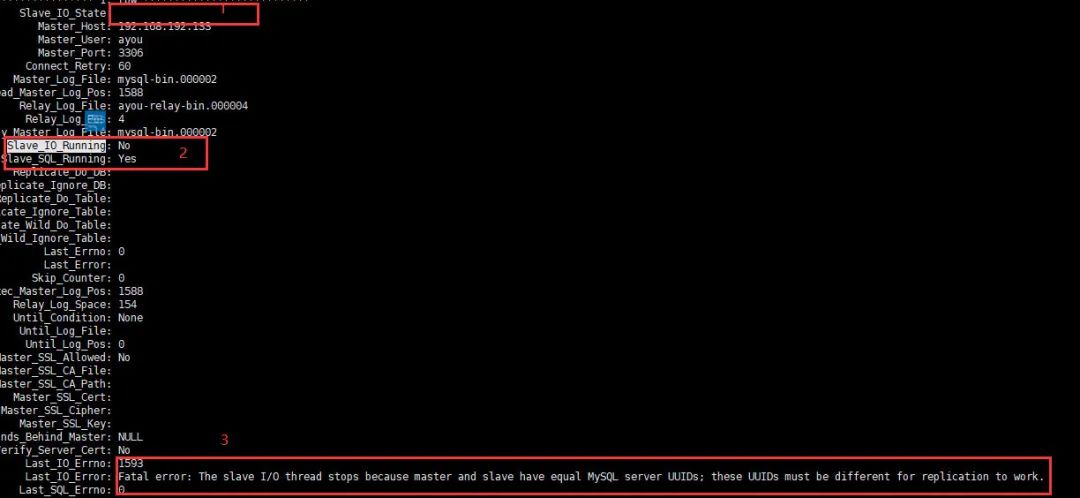 如上图所示当我们执行从机连接主机命令且开启slave后,输入命令 show slave status\G; 时 Slave_IO_State状态为空,Slave_IO_State为NO,还有上图第三点错误,这个错误说的是从机数据库和主机数据的的UUID相等,所以直接导致了这个错误