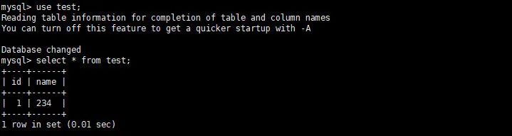 如上所示我们在主机数据库创建了test数据库,在test数据库中创建了test数据表,在表中插入了一条记录,按理说主从连接通道已经建立好此时去从机查看就会和主机数据一致,我们查看从机数据库。
