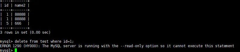 ERROR 1290 (HY000): The MySQL server is running with the --read-only option so it cannot execute this statement