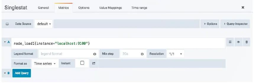 对于SingleStat Panel而言,其只能处理一条时间序列,否则页面中会提示“Multiple Series Error”错误信息。这里使用如下PromQL查询当前主机负载: