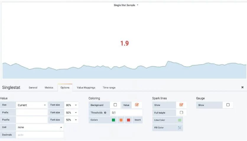 默认情况下,当前面板中会显示当前时间序列中所有样本的平均值,而实际情况下,我们 需要显示的是当前主机当前的负载情况,因此需要通过SingleStat Panel的Options选项控制当前面板的显示模式: