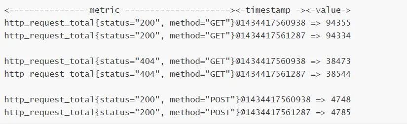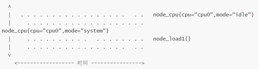 Prometheus会将所有采集到的样本数据以时间序列(time-series)的方式保存在内存数据库中,并且定时保存到硬盘上。time-series是按照时间戳和值的序列顺序存放的,我们称之为向量(vector). 每条time-series通过指标名称(metrics name)和一组标签集(labelset)命名。如下所示,可以将time-series理解为一个以时间为Y轴的数字矩阵: