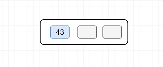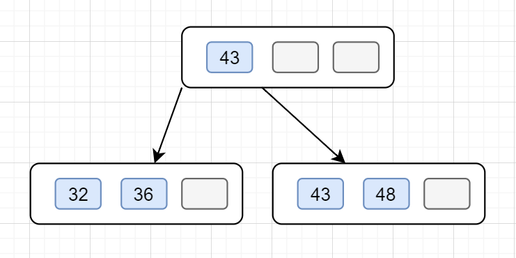 继续插入 32,发现当前节点关键字已经不小于阶数4了,于是分裂 第⌈4/2⌉=2(下标0,1,2)个,也即43上移到父节点。