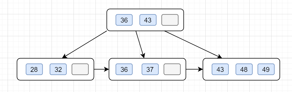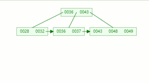 第二步访问节点(28,32),找到32,于是开始遍历链表,把[32,40]区间值找出来,这也是B+树比B-树高效的地方。