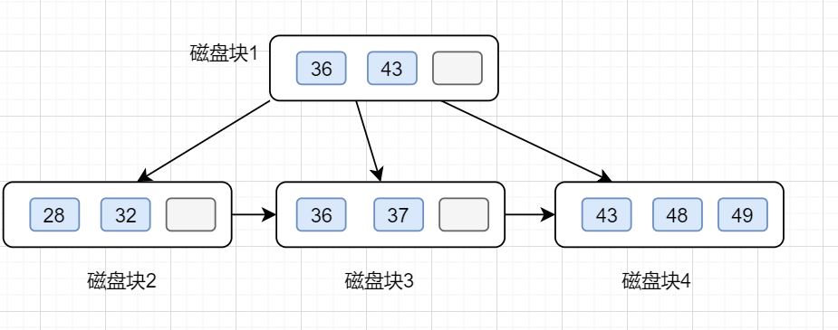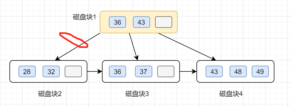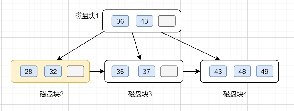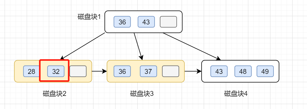 第二次磁盘 I/O, 查找磁盘块2,即根节点的第一个孩子节点,获得区间(28,32),遍历即可得32.